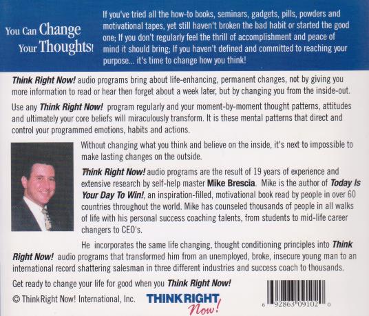 Use any Think Right Now! program regularly and your moment-by-moment thought patterns, attitudes and ultimately your core beliefs will miraculously transform. It is these mental patterns that direct and control your programmed emotions, habits and actions. Without changing what you think and believe on the inside, it's next to impossible to make lasting changes on the outside. Think Right Now! audio programs are the result of 19 years of experience and extensive research by self-help master Mike Brescia.
