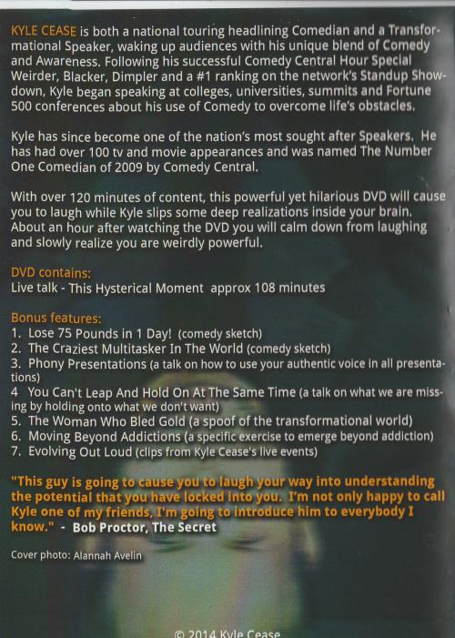 With over 120 minutes of content, this powerful yet hilarious DVD will taus =111 you to laugh while Kyle slips some deep realizations inside your brain, About an hour after watching the DVD you will calm down from laughing and slowly realize you are weirdly powerful. DVD contains: Live talk - This Hysterical Moment approx 108 minutes Bonus features: 1. Lose 75 Pounds in 1 Day! (comedy sketch) 2. The Craziest Multitasker In The World (comedy sketch) 3. Phony Presentations (a talk on how to use your authentic voice In all presenta-tions) 4 You Can't Leap And Hold On At The Same Time (a talk on what we are miss-ing by holding onto what we don't want) 5. The Woman Who Bled Gold (a spoof of the transformational world) 6. Moving Beyond Addictions (a specific exercise to emerge beyond addiction) 7. Evolving Out Loud (clips from Kyle Cease's live events)
