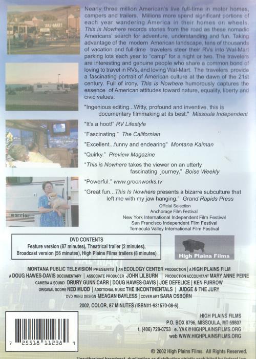 Taking advantage of the modern American landscape, tens of thousands of vacation and full-time travelers steer their RVs into Wal-Mart parking lots each year to camp for a night or two. The travelers are interesting and genuine people who share a common bond: loving to travel in RVs and loving Wal-Mart. The film provides a fascinating portrait of American culture at the dawn of the 21st century. Full of irony, This Is Nowhere humorously captures attitudes toward nature, equality, liberty and civic values.