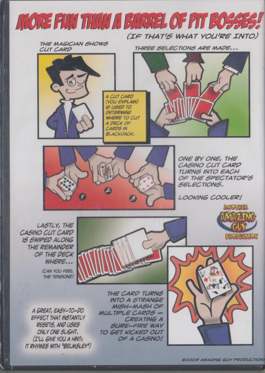 The magician shows a cut card (you explain it is used to determine where to cut a deck of cards in blackjack). One by one, the casino cut card turns into each spectator's selection, looking cooler with each reveal. Lastly, the casino cut card is swiped along the remainder of the deck where the card turns into a strange multi-card fish of multiple cards, creating a sure-fire way to get kicked out of a casino!