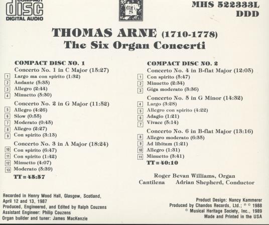 Thomas Arne's The Six Organ Concerti performed by Roger Bevan Williams at the organ of Henry Wood Hall in Glasgow, Scotland. Recorded in Henry Wood Hall, Glasgow, Scotland. Produced, Engineered, and Edited by Ralph Couzens. Album features Cantilena conducted by Adrian Shepherd.