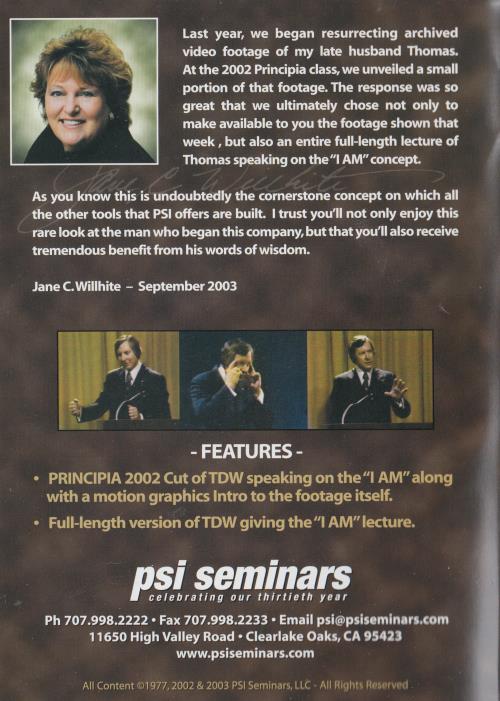 Last year, we began resurrecting archived video footage of my late husband Thomas. At the 2002 Principia class, we unveiled a small portion of that footage. The response was so great that we ultimately chose not only to make available to you the footage shown that week , but also an entire full-length lecture of Thomas speaking on the"! AM" concept. As you know this is undoubtedly the cornerstone concept on which all the other tools that PSI offers are built. I trust you'll not only enjoy this rare look at the man who began this company, but that you'll also receive tremendous benefit from his words of wisdom. For DVD Player (North American NTSC)