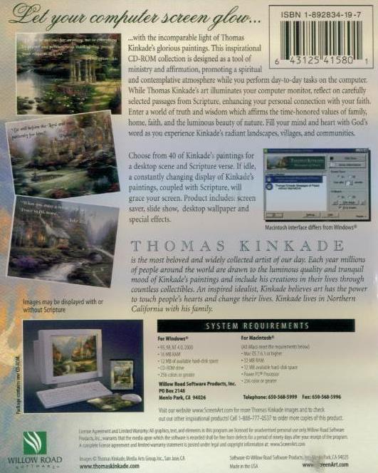 Inspirational Screen Saver. Let Your computer screen glow with incomparable light of Thomas Kinkade's paintings. 40 of his best-loved paintings, coupled with heart-warming text. This inspirational CD-ROM collection is designed as a tool of ministry and affirmation, promoting a spiritual and contemplative atmosphere while you perform day-to-day tasks on the computer. While Thomas Kinkade's art illuminates your computer monitor, reflect on carefully selected passages from Scripture, enhancing your personal connection with your faith. Enter a world of truth and wisdom which affirms the time-honored values of family, home, faith, and the luminous beauty of nature. Fill your mind and heart with God's word as you experience Kinkade's radiant landscapes, villages, and communities. Choose from 40 of Kinkade's paintings for a desktop scene and Scripture verse.