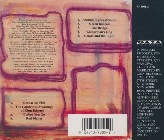 Credits: Donna Croughn - vocals, violin. John Hamilton - guitars, vocals, sitar, mandolin. Jane Scarpantoni - cello. Dave Dreivitz - bass, vocals, trumpet. Andy Demos - drums, tabla, soprano saxophone. Additional musicians: Henry Hirsch - piano on Grown-up Fish; Jack Petrucelli - mellotron on Red Planet; Laura Demos - flute on Around it goes Around. All songs written by Tiny Lights, except the lyrics for "Colors and the Light" written by John Mastro. Produced by John Hamilton with Tiny Lights. Album design by Pamela DeCesare. Artwork by Donna. Photo by Fred Slavin. All songs © 1988 Little Wave Music (ASCAP) and Uriel Music (BMI).