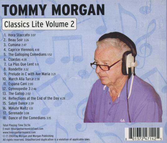 Tommy Morgan is described on the cover as the world's most listened to harmonica player. He presents classical and popular classical style pieces arranged for harmonica. These recordings showcase the expressive and lyrical qualities of the harmonica while interpreting well known classical melodies. The album compiles a selection of shorter classical works and light classics performed in a clear, melodic instrumental style.