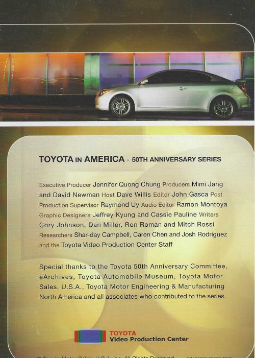 TOYOTA IN AMERICA - 50TH ANNIVERSARY SERIES Executive Producer Jennifer Quong Chung Producers Mimi Jang and David Newman Host Dave Willis Editor John Gasca Post Production Supervisor Raymond Uy Audio Editor Ramon Montoya Graphic Designers Jeffrey Kyung and Cassie Pauline Writers Cory Johnson, Dan Miller, Ron Roman and Mitch Rossi Researchers Shar-day Campbell, Caren Chen and Josh Rodriguez and the Toyota Video Production Center Staff Special thanks to the Toyota 50th Anniversary Committee, eArchives, Toyota Automobile Museum,