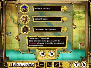 First, after selecting which company to represent, you'll start building the railroad, complete with blasting tunnels, building bridges and laying track. The government will grant you a set amount of cash to begin with and you'll need to manage it well to avoid bankruptcy. The second task is to save the railroad from sabotage at the hands of six real-life outlaws hired by a master criminal to keep the job from being completed. To aid you in this endeavor, you can choose from real-life characters such as Calamity Jane, Tomahawk Beckwourth or Wild Bill Hickok.