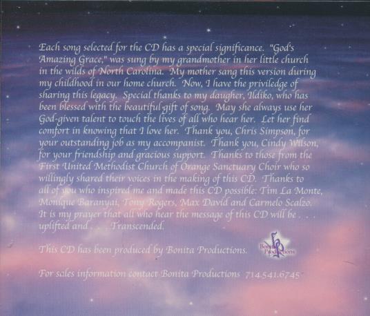 Each song selected for the CD has a special significance. "God's Amazing Grace," was sung by my grandmother in her little church in the wilds of North Carolina. My mother sang this version during my childhood in our home church. Now, I have the privilege of sharing this legacy. Special thanks to my daughter, Ildiko, who has been blessed with the beautiful gift of song. May she always use her God-given talent to touch the lives of all who hear her. Let her find comfort in knowing that I love her. Thank you, Chris Simpson, for your outstanding job as my accompanist. Thank you, Cindy Wilson, for your friendship and gracious support. Thanks to those from the First United Methodist Church of Orange Sanctuary Choir who so willingly shared their voices in the making of this CD. Thanks to all of you who inspired me and made this CD possible: Tim La Monte, Monique Baranyai, Tony Rogers, Max David and Carmelo Scalzo. It is my prayer that all who hear the message of this CD will be . . . uplifted and . . . Transcended. This CD has been produced by Bonita Productions.