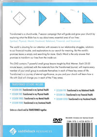 Taught by Rick Warren. Transformed: How God Changes Us 7-Session DVD Study. Tranformed is a church-wide, 7-session campaign that will guide and grow your church by exploring what he Bible has to say about every essential area of our lives: Spiritual, Physical, Mental, Emotional, Relational, Financial, and Vocational