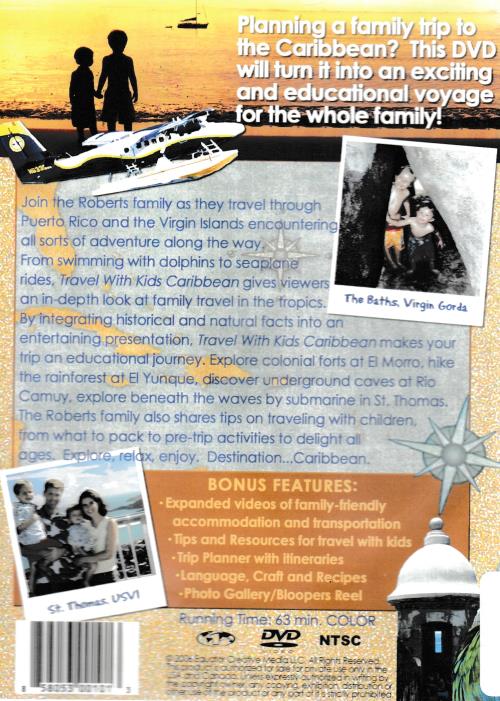 Planning a family trip to the Caribbean ? This DVD will turn in into an exciting and educational voyage for the whole family!Join the Robert family as they travel through Puerto Rico and the Virgin Islands encountering all sorts of adventure along the way. From swimming with dolphins to seaplane rides, Travel With Kids Caribbean gives viewers an in-depth look at family travel in the tropics. By integrating historical and natural facts into an entertaining presentation, Travel With Kids Caribbean makes your trip an educational journey. Explore colonial forts at el Morro, hike the rainforest at El Yunque, discover underground caves at Rio Camuy, explore beneath the waves by submarine in St. Thomas. The Roberts family also shares tips on traveling with children, from what to pack to pre-trip activities to delight all ages. Explore, relax, enjoy. Destination...Caribbean.