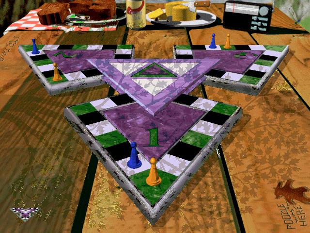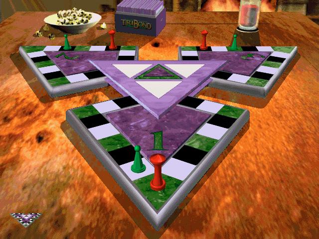 Players are given a list of three items and must determine the common bond. Landing on another pawn brings up a challenge situation, where the winner stays put and the loser moves back. First team to bring their three pawns around the triangles wins.