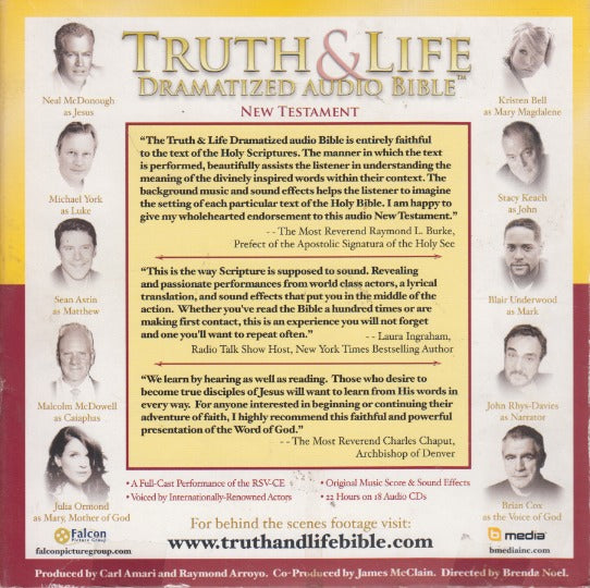 "The Truth & Life Dramatized audio Bible is entirely faithful to the text of the Holy Scriptures. The manner in which the text is performed, beautifully assists the listener in understanding the meaning of the divinely inspired words within their context. The background music and sound effects helps the listener to imagine the setting of each particular text of the Holy Bible. I am happy to give my wholehearted endorsement to this audio New Testament." - - The Most Reverend Raymond L. Burke, Prefect of the Apostolic Signatura of the Holy See