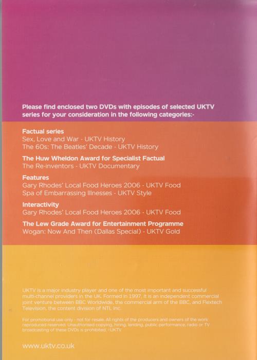 Please find enclosed two DVDs with episodes of selected UKTV series for your consideration in the following categories: