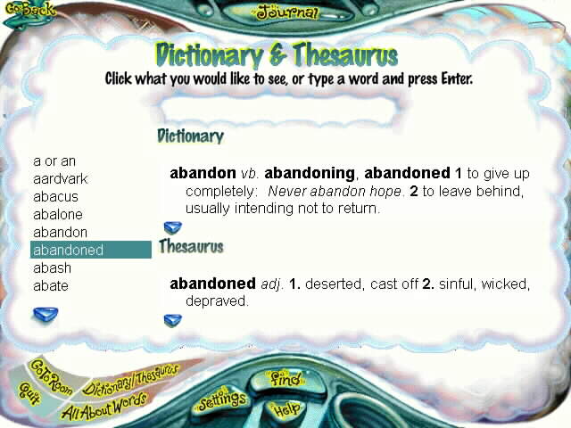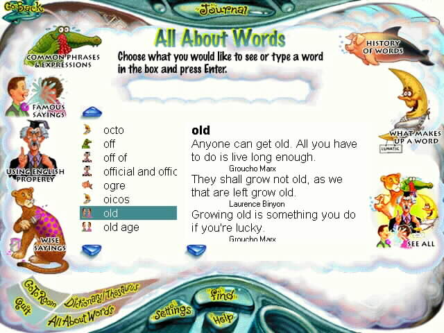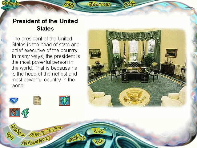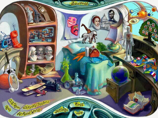 Children start a search by clicking on objects in Zak'sroom. Each object represents one of 17 categories such as Animals Sports or History. Jump to related information with over 35000 links to maps photos time lines videos and other articles. Watch concepts come to life completewith animation music and narration. Pump up your word power! Every word islinked to a dictionary definition. Plus find synonyms quotations famoussayings and expressions.