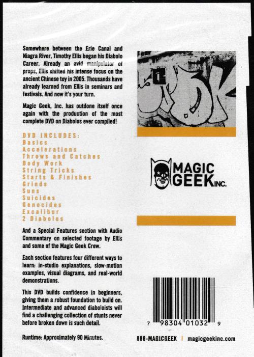 Magic Geek, Inc. And a Special Features section with Audio Commentary on selected footage by Ellis and some of the Magic Geek Crew. Each section features four different ways to learn: in-studio explanations, slow-motion examples, visual diagrams, and real-world demonstrations. This DVD builds confidence in beginners, giving them a robust foundation to build on. Intermediate and advanced diaboloists will find a challenging collection of stunts never before broken down in such detail. Runtime: Approximately 90 Minutes.