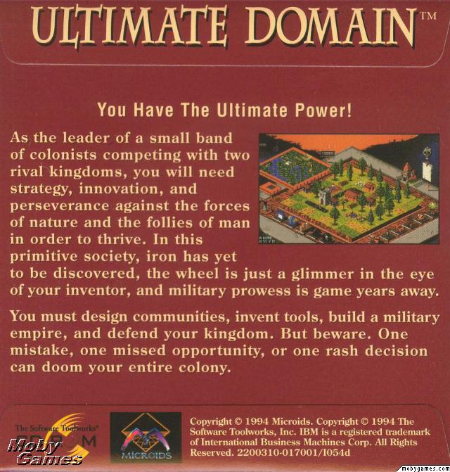 You manage your population of farmers, architects, woodsmen, carpenters, inventors, blacksmiths and specialists to insure a strong economy, good storage facilities, and efficient use of raw materials for your inventions that will lead you to success in the quest to rule the world. You'll embark on avenues of colonization, expansion, conquest, diplomacy and exploration in search of the Jewels of Neort which are the centerpiece of the main objective of Ultimate Domain.