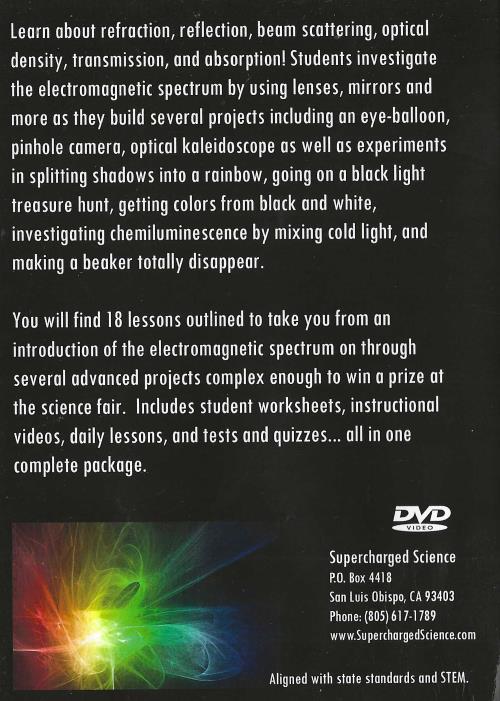 Learn about refraction, reflection, beam scattering, optical density, transmission, and absorption! Students investigate the electromagnetic spectrum by using lenses, mirrors and more as they build several projects including an eye-balloon, pinhole camera, optical kaleidoscope as well as experiments in splitting shadows into a rainbow, going on a black light treasure hunt, getting colors from black and white, investigating chemiluminescence by mixing cold light, and making a beaker totally disappear. Ultimate Science Curriculum Light 1 cc • Video DVD by Aurora Lipper Supercharged Science You will find 18 lessons outlined to take you from an introduction of the electromagnetic spectrum on through several advanced projects complex enough to win a prize at the science fair. Includes student worksheets, instructional videos, daily lessons, and tests and quizzes... all in one complete package.