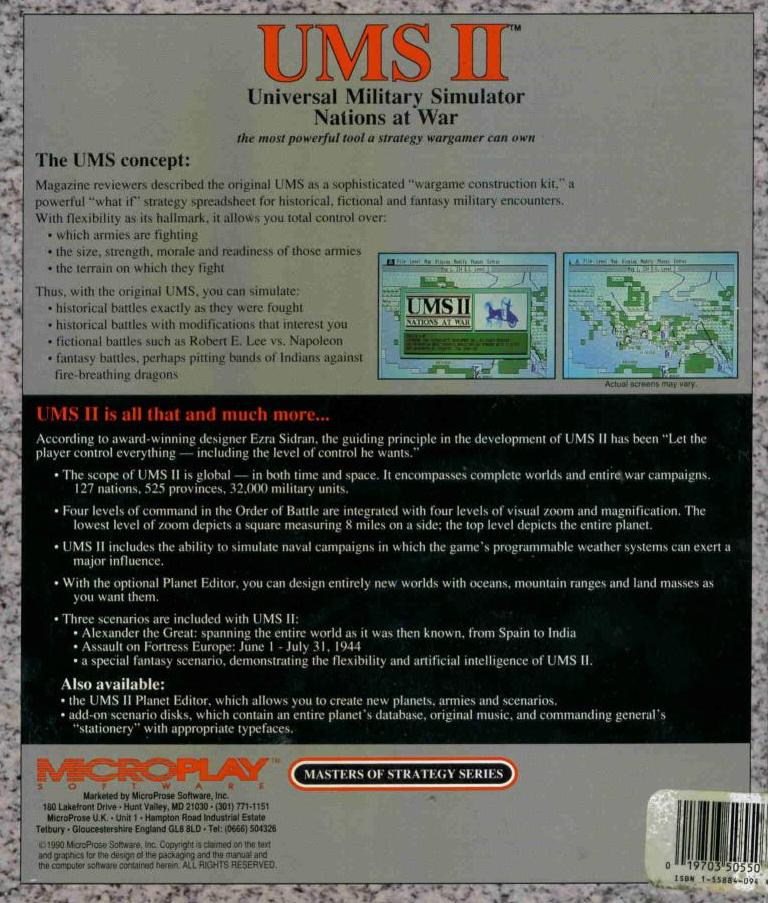 Universal Military Simulator. The original game was described as a wargame construction kit and UMS II: Nations at War continues the concept with updated mechanics and three scenarios that basically showcase the capability of the game. The simulator is part of the MicroPlay Software Masters of Strategy Series and contains a full complement of tools and instructions for recreating any historical battle based on actual events, modified historical battles with "what if" scenarios, fictional alternative history battles (e.g., Caesar's Roman army vs. General George Custer) and fantasy-based battles, all of which are limited only by the user's imagination.