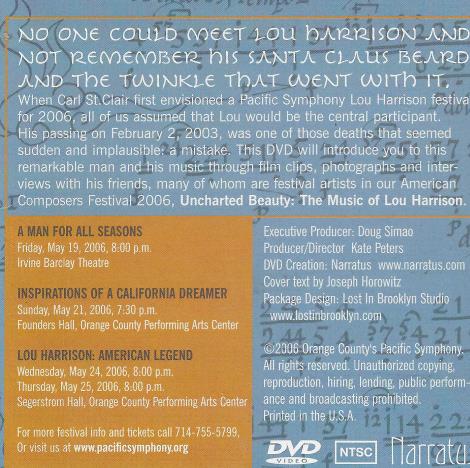 When Carl St.Clair first envisioned a Pacific Symphony Lou Harrison festival for 2006, all of us assumed that Lou would be the central participant. His passing on February 2, 2003, was one of those deaths that seemed sudden and implausible: a mistake. This DVD will introduce you to this remarkable man and his music through film clips, photographs and inter-views with his friends, many of whom are festival artists in our American Composers Festival 2006, Uncharted Beauty: The Music of Lou Harrison.