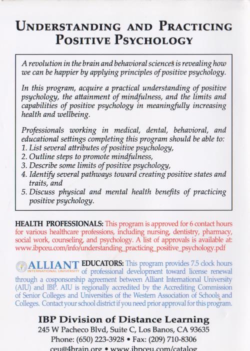 Professionals working in medical, dental, behavioral, and educational settings completing this program should be able to: 1. List several attributes of positive psychology, 2. Outline steps to promote mindfulness, 3. Describe some limits of positive psychology, 4. Identify several pathways toward creating positive states and traits, and 5. Discuss physical and mental health benefits of practicing positive psychology. HEALTH PROFESSIONALS: This program is approved for 6 contact hours for various healthcare professions, including nursing, dentistry, pharmacy, social work, counseling, and psychology.