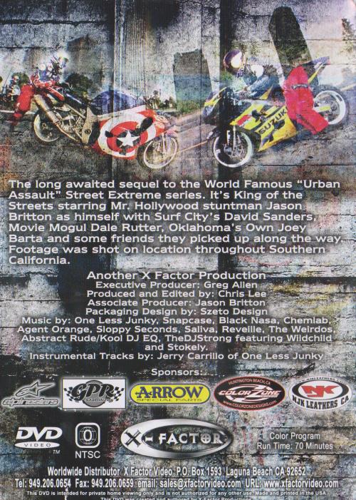 Urban Assault 2The long awaited sequel to the World Famous "Urban Assault" Street Extreme series. It's King of the Streets starring Mr. Hollywood stuntman Jason Britton as himself with Surf City's David Sanders, 4.Movie Mogul Dale Rutter, Oklahoma's Own Joey' Barta and some friends they picked up along the way Footage was shot on location throughout Southern California.