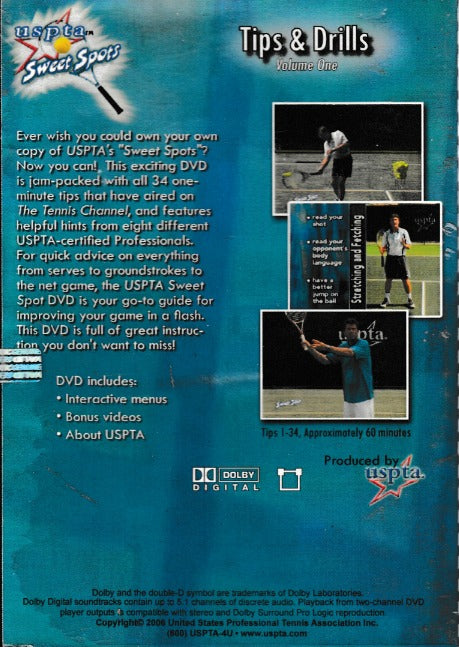 Ever wish you could own your own copy of USPTA's "Sweet Spots"? Now you can!• This exciting DVD is jam-packed-with all 34 one-minute tips that have aired on The Tennis Channel, and features helpful hints from eight different USPTA-certified Professionals. For quick advice on everything from serves to groundstrokes to the net game, the USPTA Sweet Spot DVD is your go-to guide for improving your game in a flash. This DVD is full of great instruction you don't want to miss! DVD includes: • Interactive menus • Bonus videos • About USPTA