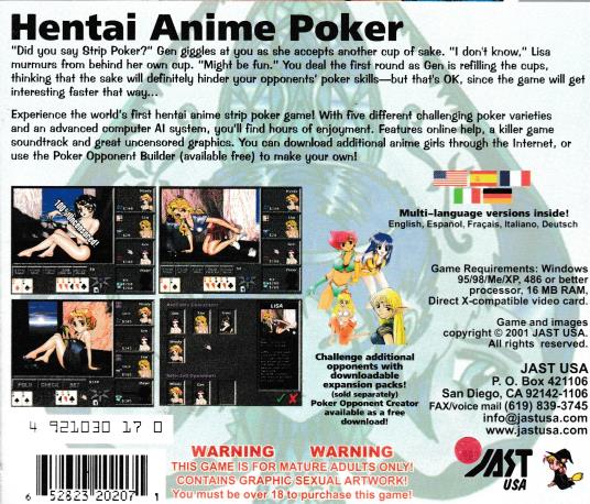 Anime Strip Poker Game or Windows Hentai Anime Poker "Did you say Strip Poker?" Gen giggles of you as she accepts another cup of sake. "I don't know," Lisa murmurs from behind her own cup. "Might be fun." You deal the first round as Gen is refilling the cups, thinking that the sake will definitely hinder your opponents' poker skills—but that's OK, since the game will get interesting faster that way... Experience the world's first henfai anime strip poker game! With five different challenging poker varieties and an advanced computer Al system, you'll find hours of enjoyment. Features online help, a killer game soundtrack and great uncensored graphics.
