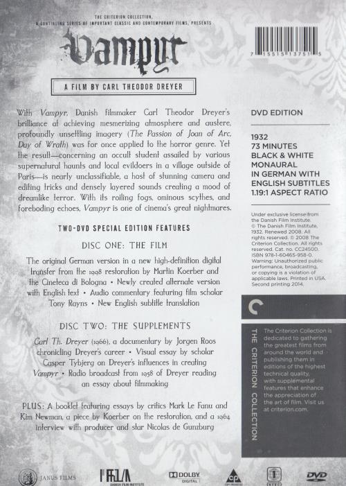 Disc Two — The Supplements: Carl Th. Dreyer (1966), a documentary by Jørgen Roos chronicling Dreyer's career; a visual essay by scholar Casper Tybjerg on Dreyer's influences in creating Vampyr; a 1958 radio broadcast of Dreyer reading an essay about filmmaking.