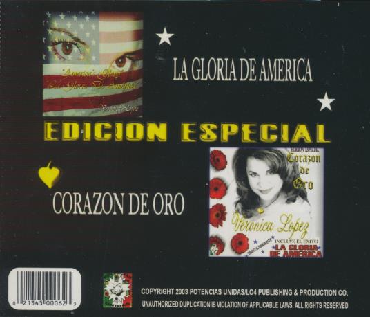 Veronica Lopez is a Latin singer who performs heartfelt ballads and patriotic songs. This Edicion Especial release, Corazon De Oro, highlights her emotive vocal style across ranchera and Latin pop arrangements. The album includes the hit La Gloria De America and a hymn dedicated to immigrants, showcasing themes of pride and belonging. Fans of traditional Mexican styles and contemporary Latin balladry will find much to enjoy here.