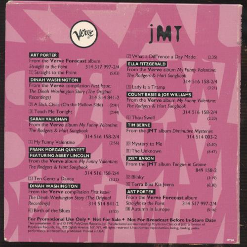 This compilation features a variety of jazz artists from the Verve and JMT labels, including Art Porter, Dinah Washington, Sarah Vaughan, Ella Fitzgerald, Count Basie & Joe Williams, Tim Berne, Joey Baron, and the Frank Morgan Quintet. The album showcases a blend of vocal and instrumental jazz styles from classic to contemporary.