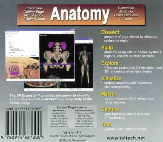 The VH Dissector Lite provides students and educators with the power to visualize and understand the complex structure of the human body through the power of virtual reality. Utilizing data from the National Library of Medicine's Visible Human Project®, the VH Dissector allows the user to interact with correlated 3D and cross sectional views of over 2,000 anatomical structures through identification, dissection, assembly and rotation. Visualizations of the human body can be created that will captivate students and encourage them to explorer further utilizing the interactive capabilities of the software.