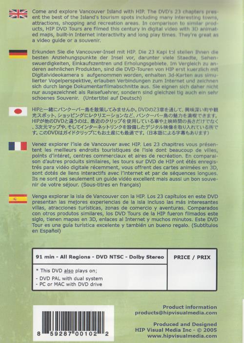 Come and explore Vancouver Island with HIP. This DVD's 23 chapters present the best of the island's tourist spots, including many interesting towns, attractions, shopping and recreation areas. Filmed in digital video with animated 3D maps, built-in Internet interactivity and long play times, this DVD makes a great video guide or souvenir.