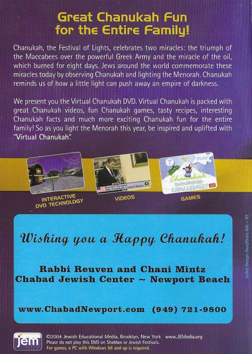 The lighting of the menorah, spinning of the dreidel, and whipping up mouth watering recipes are all exciting activities of this holiday season coming alive in the how-to guide of this interactive DVD. What makes this DVD so special and exciting is it captures the holiday with cutting edge interactive technology. No other DVD has covered the holiday of Chanukah as this amazing high tech DVD, "Virtual Chanukah."