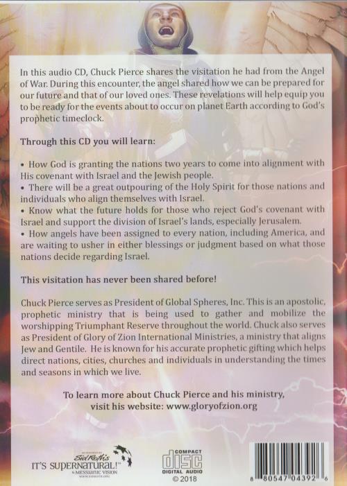 In this audio CD, Chuck Pierce shares the visitation he had from the A igel of War. During this encounter, the angel shared how we can he prepared loc our future and that of our loved ones. These revelations will help equip you to be ready for the events about to occur on planet Earth according to God's prophetic timeclock. Through this CD you will learn: • How God is granting the nations two years to come into alignment with His covenant with Israel and the Jewish people. • There will be a great outpouring of the Holy Spirit for those nations and individuals who align themselves with Israel. • Know what the future holds for those who reject God's covenant wit h Israel and support the division of Israel's lands, especially Jerusalem. • How angels have been assigned to every nation, including America, and are waiting to usher in either blessings or judgment based on what those nations decide regarding Israel. This visitation has never been shared before! Chuck Pierce serves as President of Global Spheres, Inc. This is an apostolic, prophetic ministry that is being used to gather and mobilize the worshipping Triumphant Reserve throughout the world. Chuck also serves as President of Glory of Zion International Ministries, a ministry that aligns Jew and Gentile. He is known for his accurate prophetic gifting which helps direct nations, cities, churches and individuals in understanding the times and seasons in which we live.