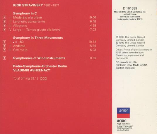 This album presents a digital recording of Stravinsky symphonies performed by the Radio-Symphonie-Orchester Berlin, conducted by Vladimir Ashkenazy. It was made in the USA and includes the booklet enclosed. The cover photo of Igor Stravinsky was taken from the book "Stravinsky in Pictures and Documents."
