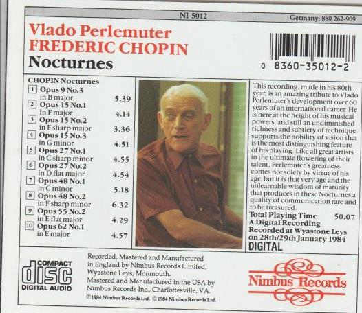 Vlado Perlemuter: Chopin Nocturnes w/ Artwork MUSIC AUDIO CD Nimbus 1992 Classic