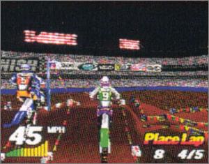 The first motocross game on PlayStation, VMX Racing features eight 125cc and 250cc bikes competing in four single-player circuits: Enduro, National, Supercross, and Full. After selecting a bike, each individually rated in acceleration, braking, throttle, and speed, you'll compete on one of six courses against seven computer-controlled riders. Earn points by performing an assortment of stunts or by achieving a first-place finish. VMX Racing also includes head-to-head racing against a friend on either a horizontal or vertical split-screen display.