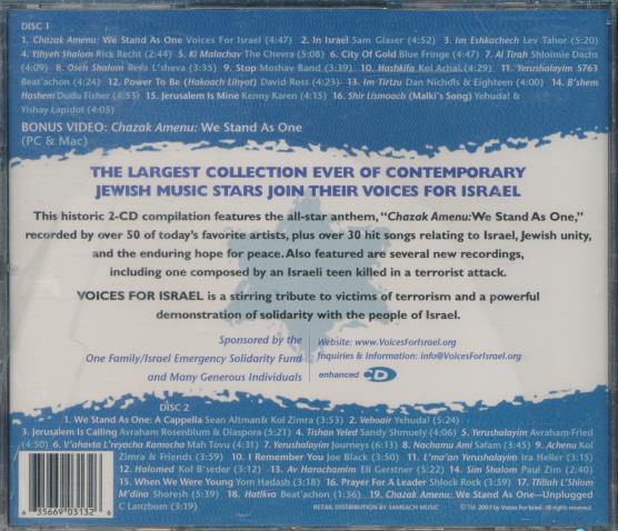 Voices For Israel is a charity 2-CD compilation that brings together over 50 contemporary Jewish artists to raise funds for victims of terrorism in Israel. The collection features the all-star anthem "Chazak Amenu: We Stand As One" and more than 30 songs celebrating Israel, Jewish unity and the enduring hope for peace. Styles range from contemporary Jewish pop and rock to traditional and a cappella arrangements, showcasing artists from across the Jewish music scene. Several tracks are new recordings, making this both a tribute and a showcase of modern Jewish music.