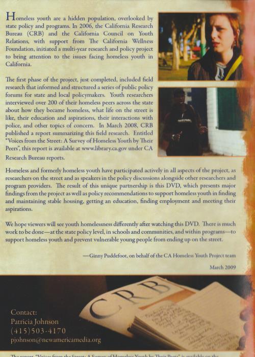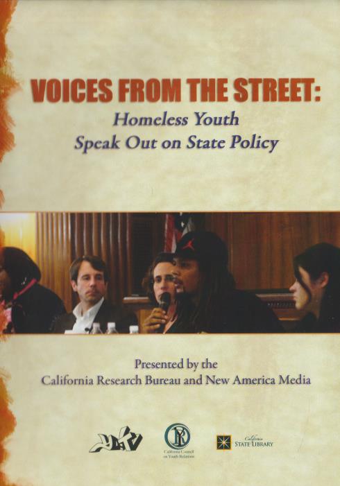 Homeless youth are a hidden population, overlooked by state policy and programs. In 2006, the California Research Bureau (CRB) and the California Council on Youth Relations, with support from The California Wellness Foundation, initiated a multi-year research and policy project to bring attention to the issues facing homeless youth in California. The first phase of the project, just completed, included field research that informed and structured a series of public policy forums for state and local policymakers. Youth researchers interviewed over 200 of their homeless peers across the state about how they became homeless, what life on the street is like, their education and aspirations, their interactions with police, and other topics of concern. In March 2008, CRB published a report summarizing this field research. Entitled "Voices from the Street: A Survey of Homeless Youth by Their Peers", under CA Research Bureau reports. Homeless and formerly homeless youth have participated actively in all aspects of the project, as researchers on the street and as speakers in the policy discussions alongside other researchers and program providers. The result of this unique partnership is this DVD, which presents major findings from the project as well as policy recommendations to support homeless youth in finding and maintaining stable housing, getting an education, finding employment and meeting their aspirations.