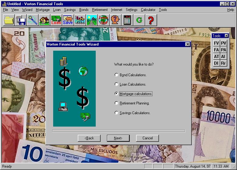 Vorton Financial Tools (VFT) is a suite of personal financial tools designed to help the average person untangle the intrinsic difficulties of money matters ranging from compound interest calculations to mortgage and retirement scenarios spanning decades. Designed for everyone from financial planners to the financial novice, Vorton Financial tools is a comprehensive software application intended to assist individuals in analyzing and making decisions in the area of personal finance. Financial Tools includes a set of easy-to-use financial calculators, a comprehensive financial glossary and a wizard to help you get started!