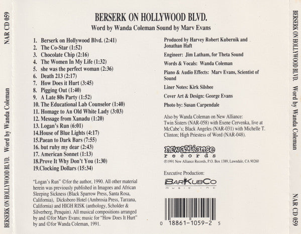 Wanda Coleman: Berserk On Hollywood Blvd. SPOKEN WORD AUDIO CD 1991 New Alliance