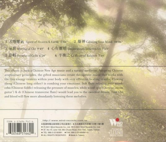 Produced by WANG Xu-dong. This album combines Chinese New Age music with natural medicine ideas. Adopting Chinese acupuncture principles, gifted musicians create therapeutic music that works with the tiny energy centers within the body to produce effective healing results. Flowing zheng lines combine with soft flute, erhu and wood guqin tones to relax the mind and release muscular pressure. Listening to these melodies can help Chi and blood flow more abundantly.