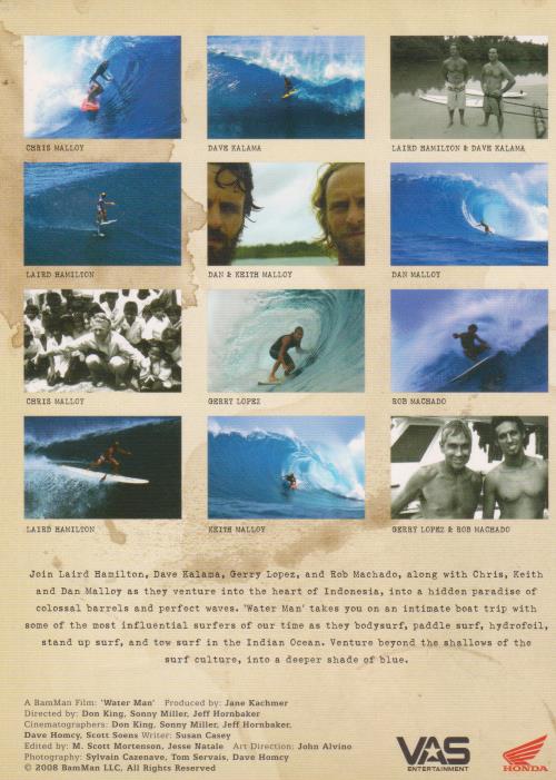 Water Man takes you on an intimate boat trip with some of the most influential surfers of our time as they bodysurf, paddle surf, hydrofoil, stand up surf and tow surf in the Indian Ocean. Join Laird Hamilton, Dave Kalama, Gerry Lopez and Rob Machado, along with Chris, Keith and Dan Malloy as they venture into the heart of Indonesia, into a hidden paradise of colossal barrels and perfect waves, and venture beyond the shallows of the surf culture into a deeper shade of blue. Riders: Laird Hamilton Dave Kalama Gerry Lopez Rob Machado Chris Malloy Keith Malloy Dan Malloy