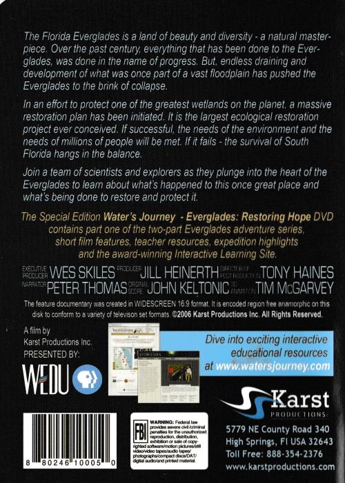 The Florida Everglades is a land of beauty and diversity - a natural master-piece. Over the past century, everything that has been done to the Ever-glades, was done in the name of progress. But, endless draining and development of what was once part of a vast floodplain has pushed the Everglades to the brink of collapse. In an effort to protect one of the greatest wetlands on the planet, a massive restoration plan has been initiated. It is the largest ecological restoration project ever conceived. If successful, the needs of the environment and the needs of millions of people will be met. If it fails - the survival of South Florida hangs in the balance. Join a team of scientists and explorers as they plunge into the head of the Everglades to learn about what's happened to this once great place and what's being done to restore and protect it. The Special Edition Water's Journey - Everglades: Restoring Hope DVD contains part one of the two-part Everglades adventure series, short film features. teacher resources, expedition highlights and the award-winning Interactive Learning Site