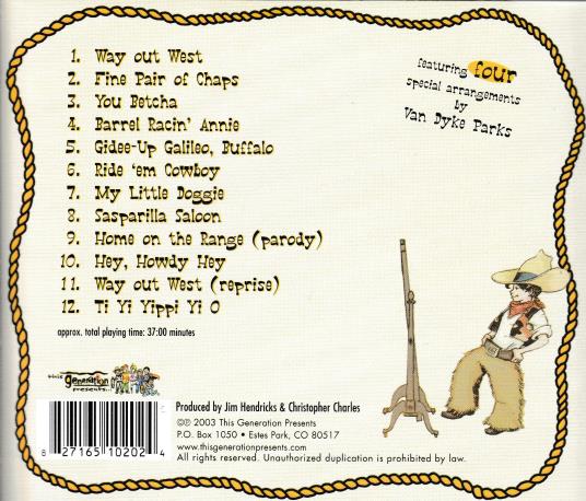 1. Way out West Z. Tine 'Pair of Chars 3. You Betcha Barrel Racin' .Annie 5. Gidee-Ur Galileo, Bur£alo Z. Ride 'em Cowboy 7. My Little Dossie 2. Ͽar!lla Saloon 9. Nome on the Range (parody) IC. Key, Noway N'ey 11. Way out West (reprise) 12. Ti Y Yirri Yi 0 approx. total playing time: 37:00 minutes