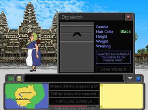 Carmen Sandiego, that criminal mastermind, is up to her old tricks once more. Players must track down her cadre of crooks and put them behind bars before going after Carmen Sandiego herself. In addition, they must figure out where Carmen is going to pull off her one-of-a-kind heist and stop her before she gets away with it. Players travel to different locations around the globe, collecting clues about the crook's next stop and putting together enough of a description to get a warrant. Once a crook has been tracked to a specific city, the player must use the description of the crook in the warrant to collar the criminal, with the help of one of the "good guides."