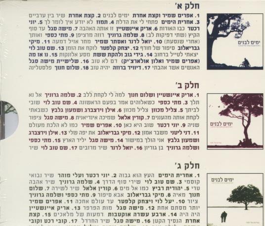 Among the highlights in the set: the title song "Yamim Levanim" in the original performance by Ephraim Shamir, "Shir L'Shira" by Corinne Allal in an early performance, and also rare recordings of Misha Segal, Ephraim Shamir, and Alon Olearchik as a duo that operated before Kaveret.