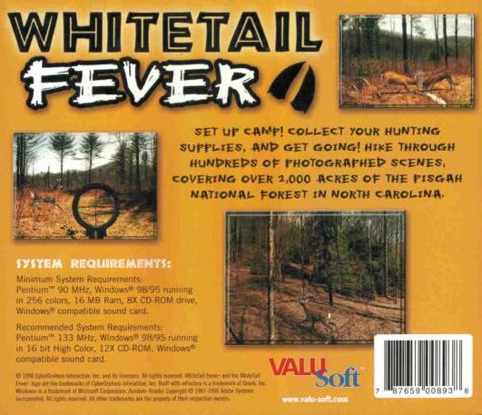 Whitetail Fever gives hunters a chance to roam photographed scenes of 2,000 square miles of the Pisgah National Forest in North Carolina and hunt whitetail deer. Setup camp! Collect your hunting supplies and get going! Hike through hundreds of photographed scenes! Each hunt is one of 16 unique scenarios resulting in 18 possible deer trophies. Each hunt is packed with photographed scenes, lifelike animations, and an original sound track. Climb mountains, cross streams, and follow trails when hunting on foot. Or choose to hunt in one of four genuine treestands or an actual hunting blind. Many of the scenes are 360-degree panoramas. And each scene was photographed on location in Harmon Den.