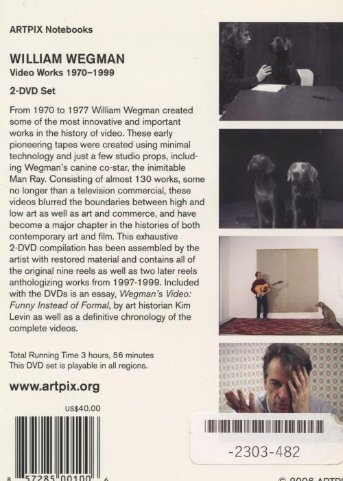 Normal 0 false false false EN-US X-NONE X-NONE /* Style Definitions */ table.MsoNormalTable {mso-style-name:"Table Normal"; mso-tstyle-rowband-size:0; mso-tstyle-colband-size:0; mso-style-noshow:yes; mso-style-priority:99; mso-style-qformat:yes; mso-style-parent:""; mso-padding-alt:0in 5.4pt 0in 5.4pt; mso-para-margin:0in; mso-para-margin-bottom:.0001pt; mso-pagination:widow-orphan; font-size:11.0pt; font-family:"Cambria","serif"; mso-ascii-font-family:Cambria; mso-ascii-theme-font:minor-latin; mso-fareast-font-family:"Times New Roman"; mso-fareast-theme-font:minor-fareast; mso-hansi-font-family:Cambria; mso-hansi-theme-font:minor-latin;} From 1970-1977 William Wegman created some of the most innovative and important works in the history of video. These early pioneering tapes were created using minimal technology and a few studio props, including Wegman’s canine companion, Man Ray. Consisting of 130 works, some no longer than a television commercial, blurred the boundaries between high and low art as well as art and commerce, and have become a major chapter in the histories of contemporary art and film. This exhaustive 2 DVD compilation has been assembled by the artist with restored material and it contains all nine original reels as well as two later reels. Classics such as Pocketbook Man, Milk/Floor, Stomach Song, Cape On, Stick and Tooth, Spelling Lesson, Dog Duet, Man Ray, Do You Want to? Are included. The DVD is accompanied by an essay,