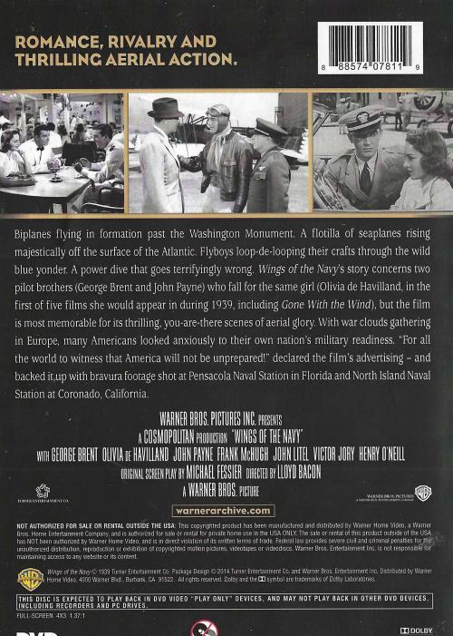 Biplanes flying in formation past the Washington Monument. A flotilla of seaplanes rising majestically off the surface of the Atlantic. Flyboys loop-de-looping their crafts through the wild blue yonder. A power dive that goes terrifyingly wrong. Wings of the Navy's story concerns two pilot brothers (George Brent and john Payne) who fall for the same girl (Olivia de Havilland, in the first of five films she would appear in during 1939, including Gone With the Wind), but the film is most memorable for its thrilling, you-are-there scenes of aerial glory. With war clouds gathering in Europe, many Americans looked anxiously to their own nation's military readiness. "For all the world to witness that America will not be unprepared!" declared the films advertising -- and backed it up with bravura footage shot at Pensacola Naval Station in Florida and North Island Naval Station at Coronado, California.